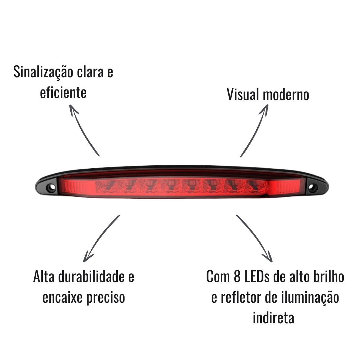 O Brake Light LED Sinalsul 2095 VM é a escolha ideal para quem busca maior segurança e visual moderno na sinalização de frenagem. Seu conjunto com 8 LEDs de alto brilho e refletor de iluminação indireta proporciona um efeito visual homogêneo, sem pontos de luz aparentes, garantindo visibilidade superior e rápida resposta durante as frenagens.