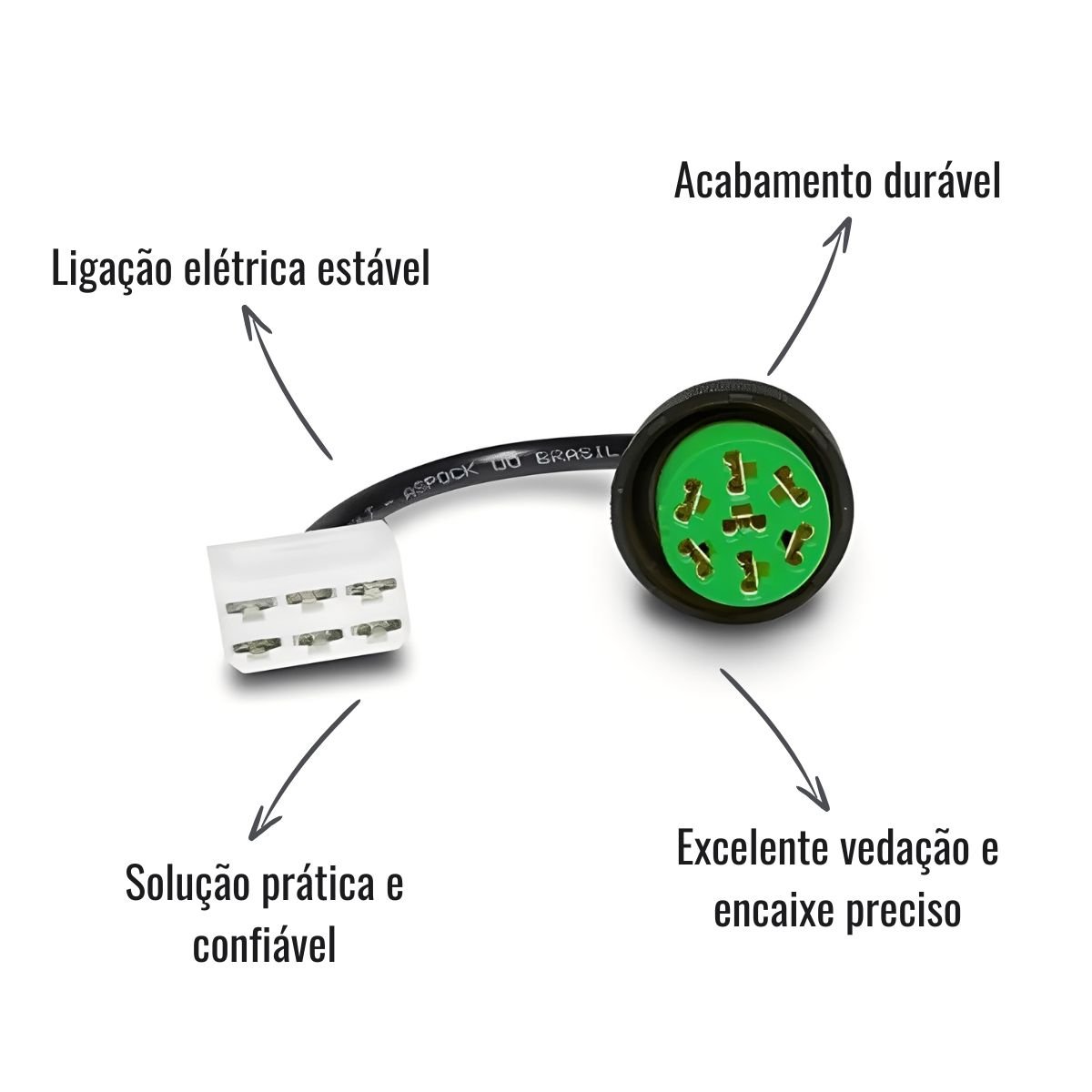Instalado no lado direito (LD), o conector facilita a substituição e manutenção, mantendo a originalidade e eficiência do conjunto elétrico do implemento. Uma solução prática e confiável para garantir segurança e desempenho nas estradas.