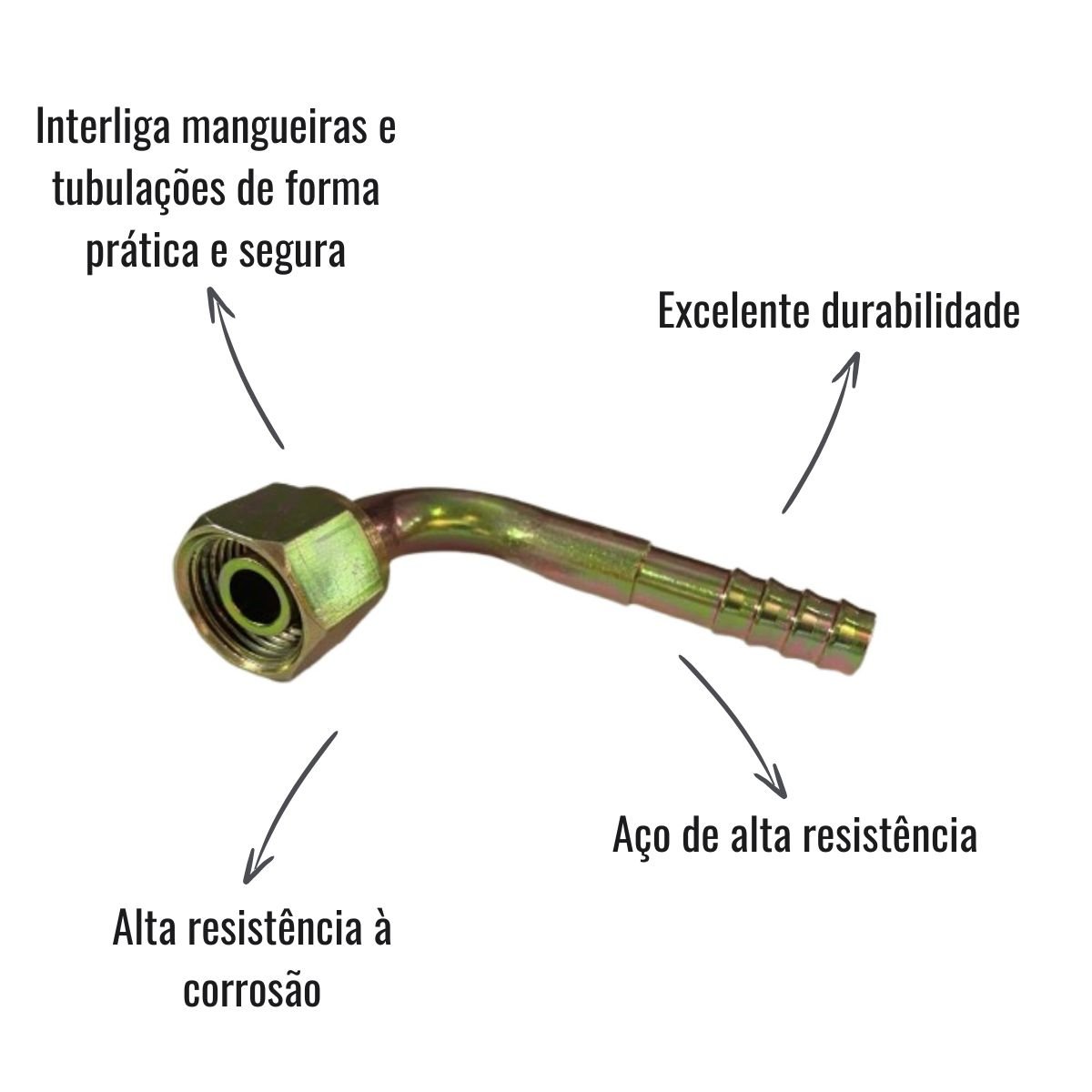 Formato: 90º — Permite redirecionamento do fluxo sem a necessidade de curvas ou dobras excessivas na mangueira