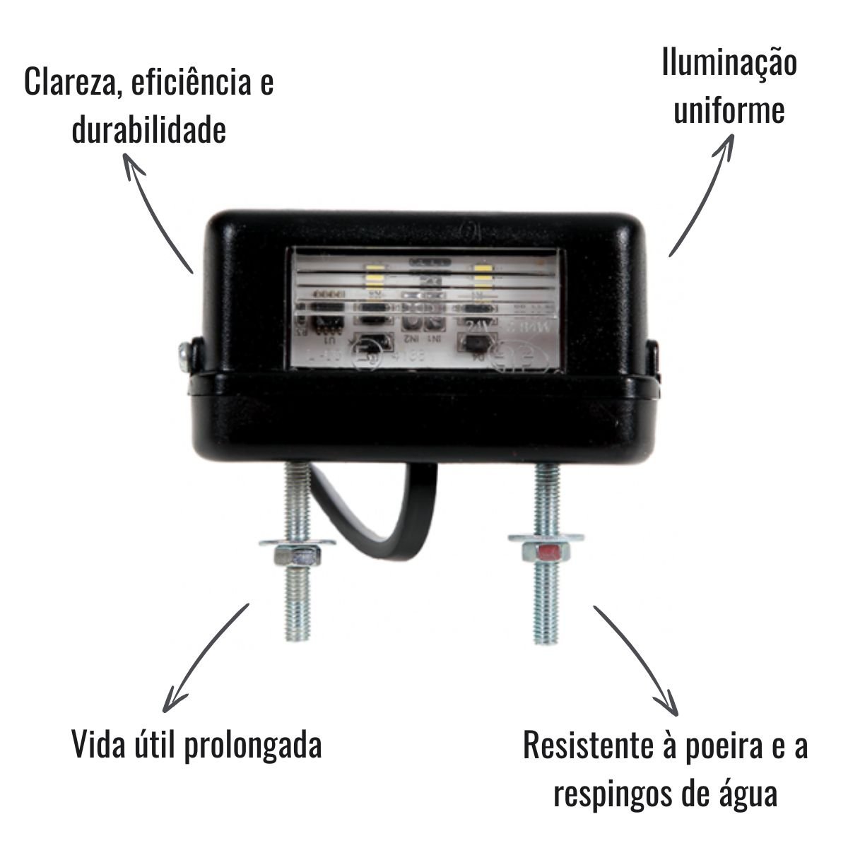 Com funcionamento bivolt 12/24V, garante vida útil prolongada e iluminação uniforme, mantendo a placa sempre visível e dentro das normas de trânsito.