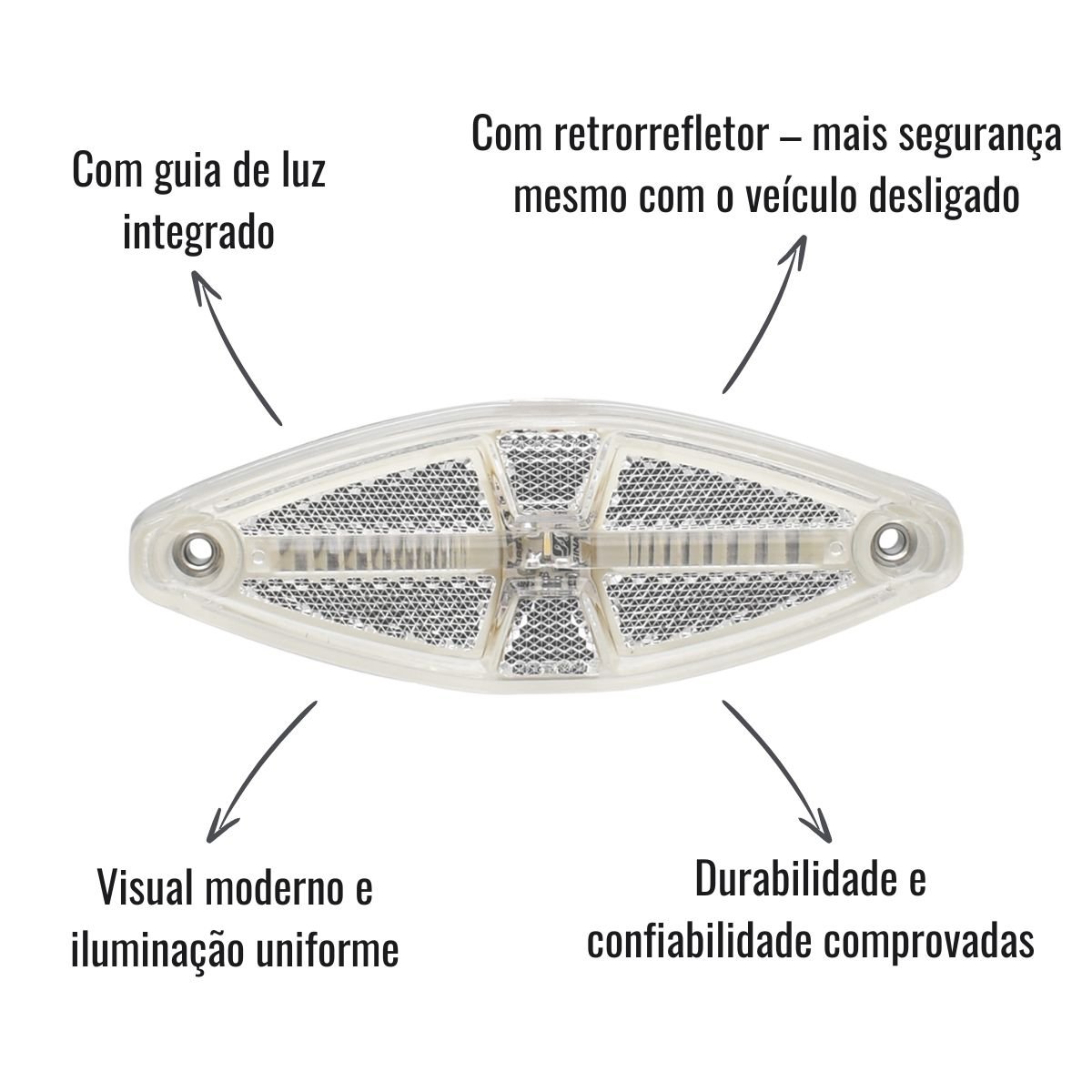 Com funcionamento em 12/24V bivolt, garante compatibilidade com diferentes sistemas elétricos, proporcionando instalação prática e eficiente. Seu design em cristal com guia de luz valoriza o visual do implemento, enquanto o retrorrefletor integrado aumenta a segurança mesmo com o veículo desligado.