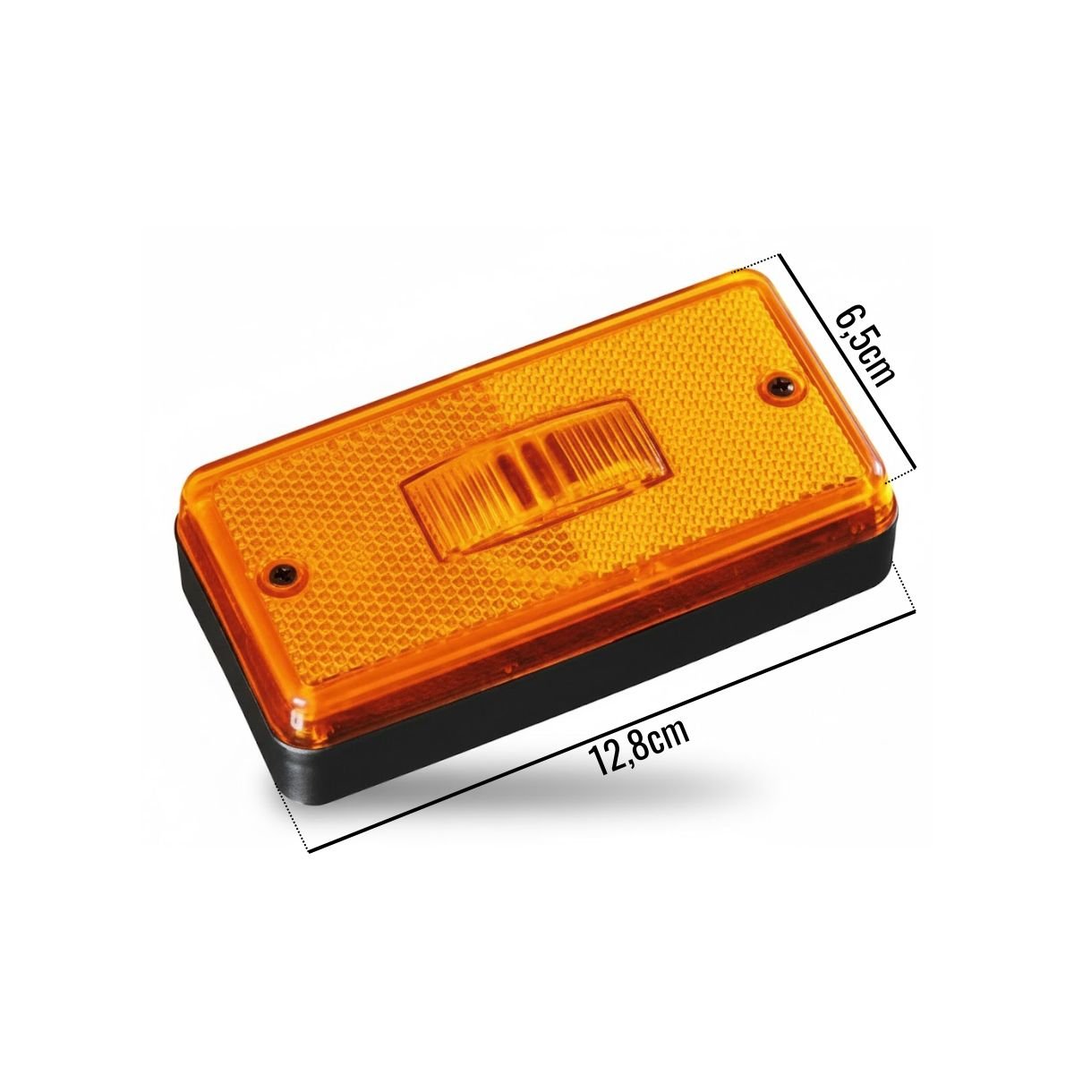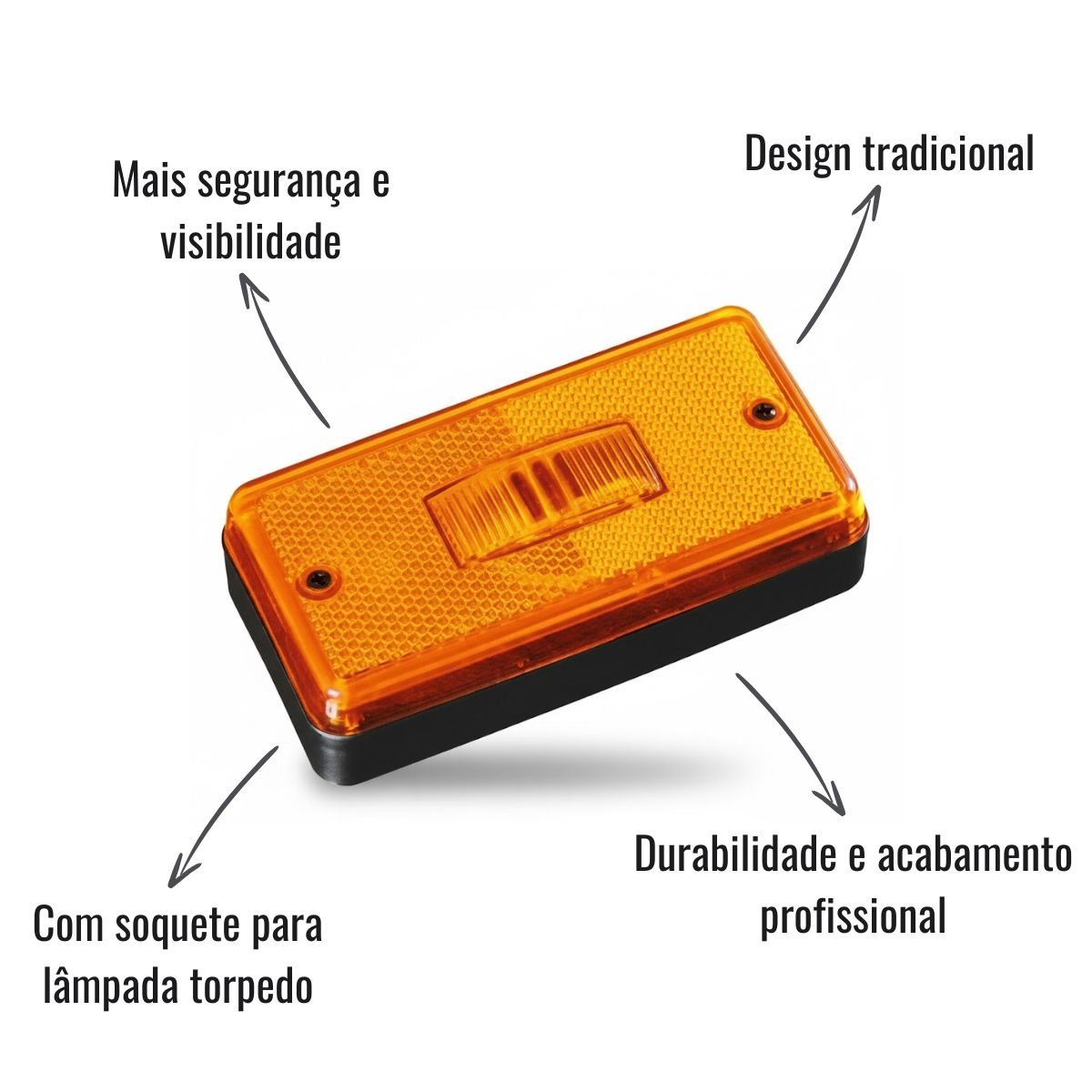 Com soquete para lâmpada torpedo e conexão por fios, a instalação é simples e prática. O retrorrefletor integrado aumenta a visibilidade mesmo com o veículo desligado, enquanto a construção resistente assegura ótimo desempenho no dia a dia. Uma solução confiável para manter a lateral sempre bem sinalizada.