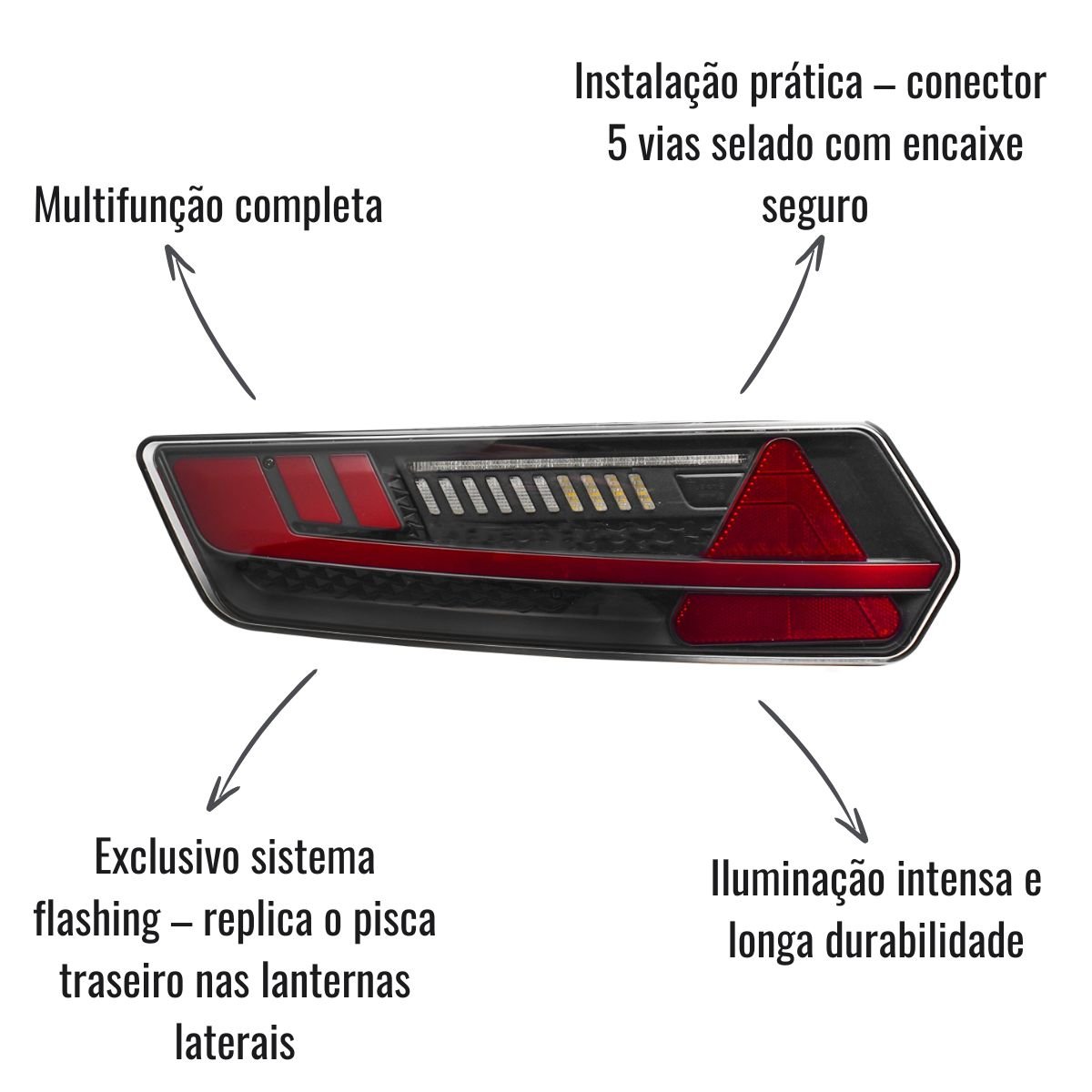 Seu sistema multifunção reúne posição, posição lateral, freio, direcional sequencial e ré em um único conjunto, além do exclusivo recurso flashing, que sincroniza o pisca traseiro com todas as lanternas laterais amarelas do implemento.