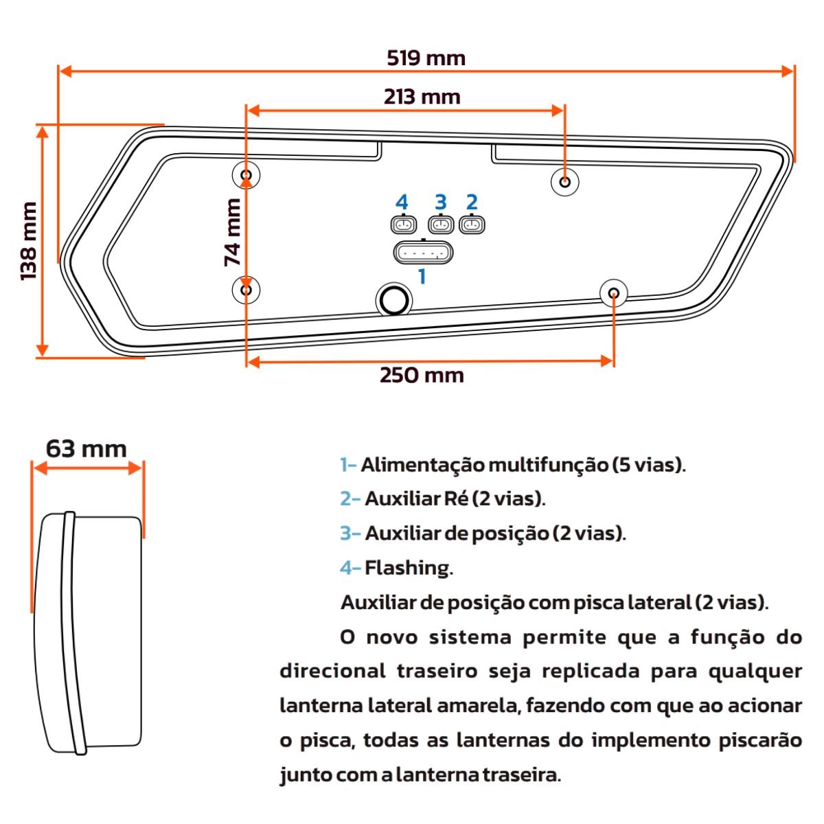 Seu sistema multifunção reúne posição, posição lateral, freio, direcional sequencial e ré em um único conjunto, além do exclusivo recurso flashing, que sincroniza o pisca traseiro com todas as lanternas laterais amarelas do implemento.