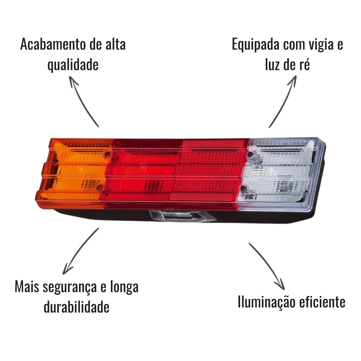 Equipada com vigia, luz de ré e conector original de 5 vias, substitui perfeitamente a peça de fábrica, preservando a originalidade e funcionalidade do caminhão.