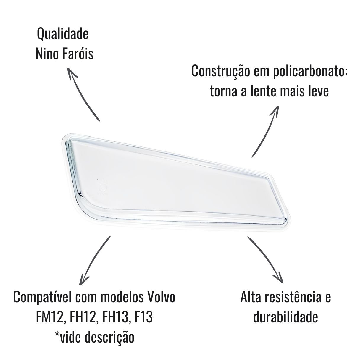 A lente de farol auxiliar Nino Faróis foi projetada para reposição ideal em veículos Volvo FH12, FH13 e FM12, fabricados de 2009 em diante. Este produto garante máxima eficiência luminosa, mantendo a segurança e visibilidade durante as viagens. A construção em policarbonato torna a lente mais leve e resistente, aumentando a durabilidade e o desempenho dos faróis auxiliares, mesmo em condições climáticas adversas e terrenos desafiadores.