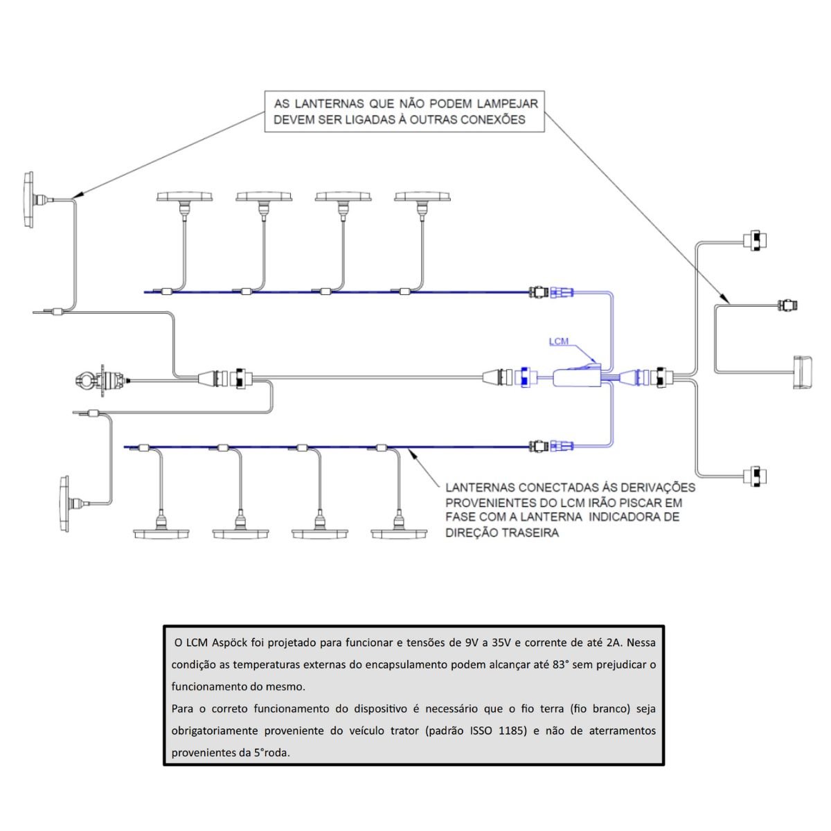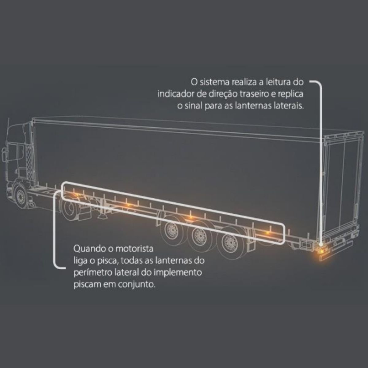 Obs.: Trata-se de um disposivo incorporado ao sistema elétrico, que faz a leitura do sinal do indicador de direção traseiro e replica para as lanternas laterais que estão conectadas nesse disposivo. Essa leitura ocorre somente quando o indicador de direção é acionado. Quando o mesmo está inativo, as lanternas operam normalmente na função de posição lateral. Além do controle de funcionamento das lanternas do perímetro lateral do veículo, o LCM também realiza o controle de leitura da sinalização do veículo rebocado pelo veículo trator, uma vez que s sistemas elétricos com iluminação a LED consomem índices de corrente menores que os sistemas elétricos com iluminação à lâmpada de bulbo. Parte da frota circulante de veículos tratores não está preparada para essa alteração, acusando erro de funcionamento quando a E.C.U. realiza a leitura dos parâmetros elétricos.