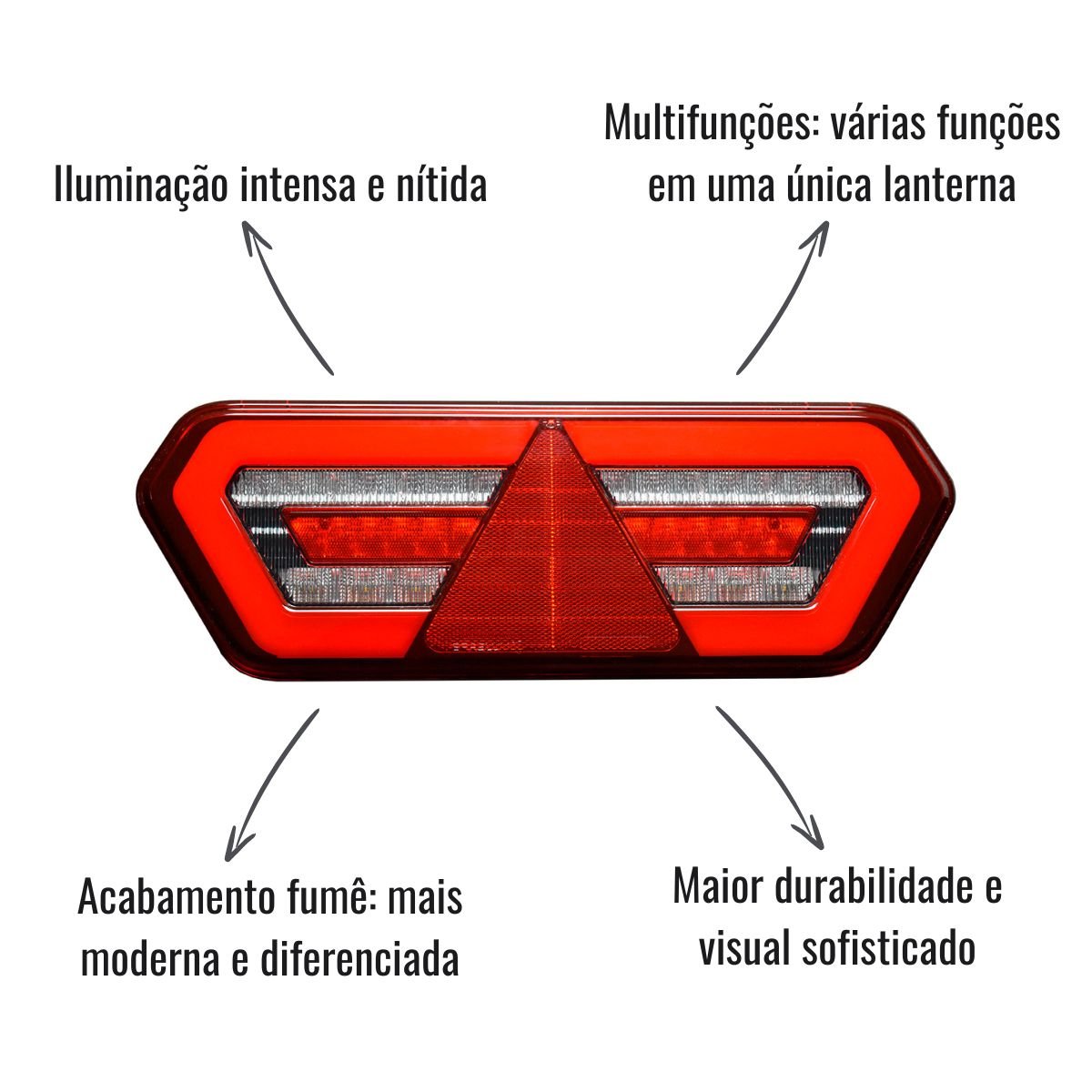 A lanterna traseira LED Braslux Diamond IV Fumê para carretas Guerra é a escolha ideal para quem busca máxima eficiência na sinalização, durabilidade e um visual sofisticado. Com tecnologia LED de alto desempenho, proporciona uma iluminação intensa e nítida, garantindo que a sinalização do veículo seja percebida com clareza em qualquer condição de estrada. O acabamento fumê confere um toque moderno e diferenciado, enquanto o pisca sequencial oferece um efeito dinâmico e mais visível para os demais motoristas. Projetada para carretas Guerra a partir de 2020, essa lanterna multifuncional conta com luz de posição, freio, seta, ré e retrorrefletor, oferecendo segurança e conformidade com as normas de trânsito. Sua estrutura robusta e fixação traseira garantem fácil instalação e resistência para enfrentar as condições severas do dia a dia no transporte rodoviário.