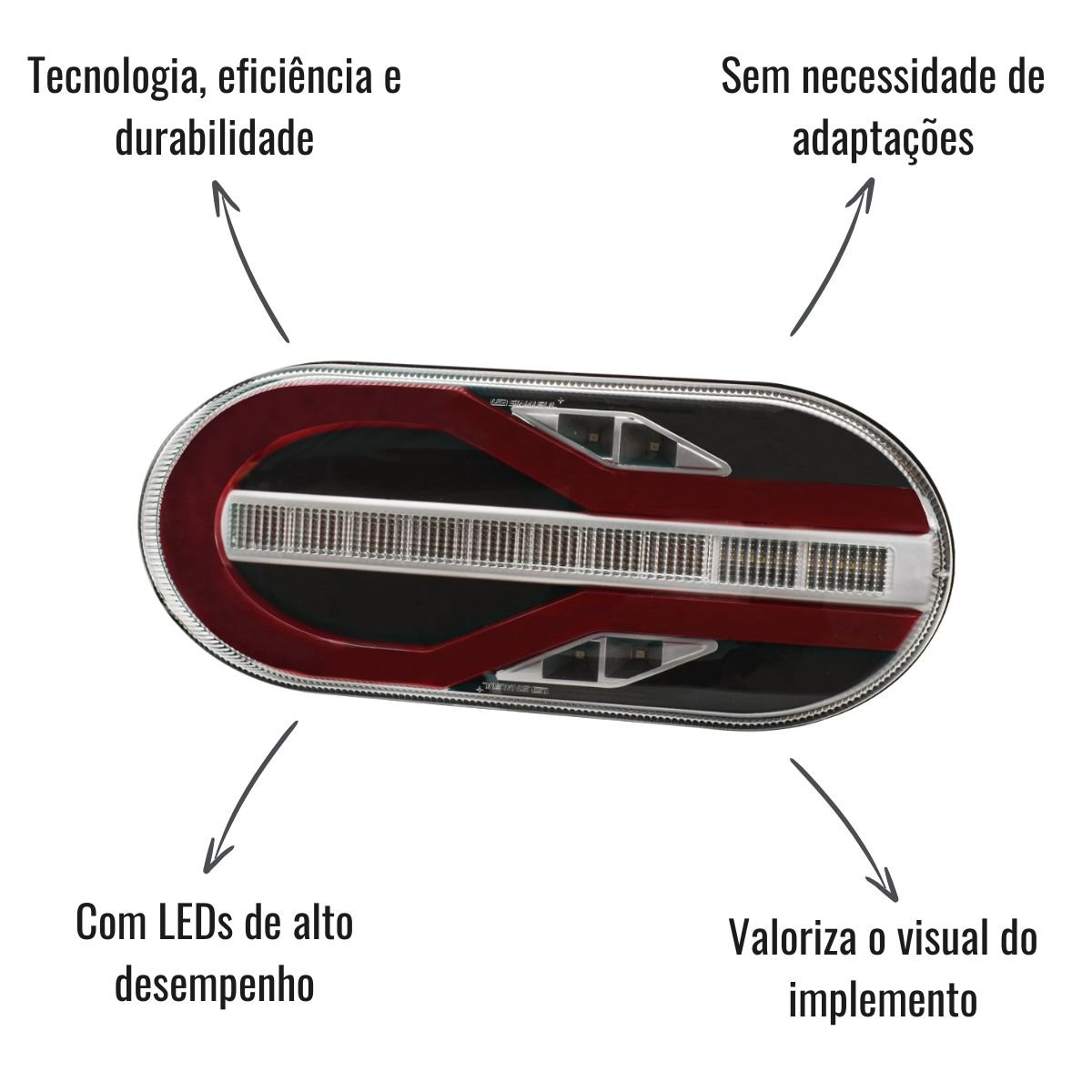O encaixe segue o padrão original, com conector selado de 5 vias + auxiliares, facilitando a instalação e evitando adaptações. Além disso, o direcional padrão integrado valoriza o visual do implemento e melhora a visibilidade para os demais motoristas.