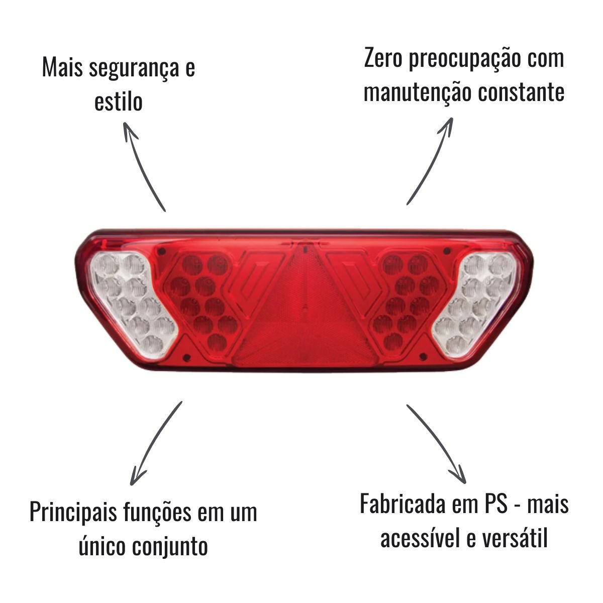 Fabricada com material PS, é leve, versátil e acessível, ideal para implementos tipo Guerra ou aplicações por adaptação. A conexão via conector de 5 vias facilita a instalação, e a iluminação em LED oferece maior durabilidade e baixa manutenção.