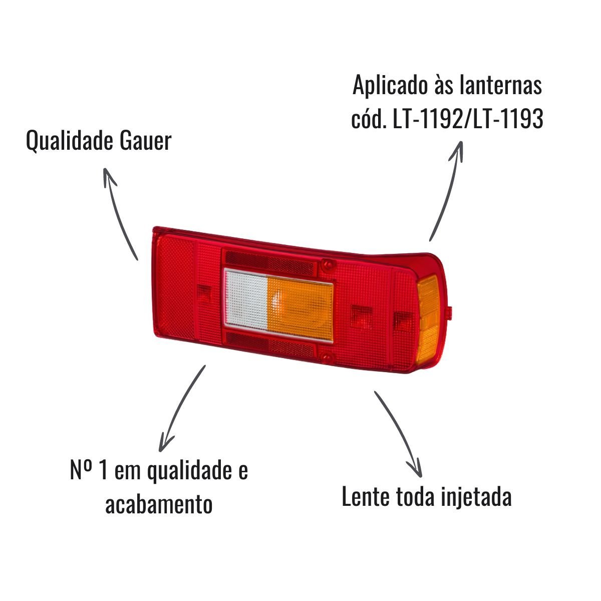 A lente para lanterna traseira Gauer LT-1191 é ideal para garantir iluminação eficiente e aspecto renovado no seu caminhão. Produzida em material injetado de alta resistência, mantém a vedação e o encaixe perfeito, preservando a performance da lanterna original.