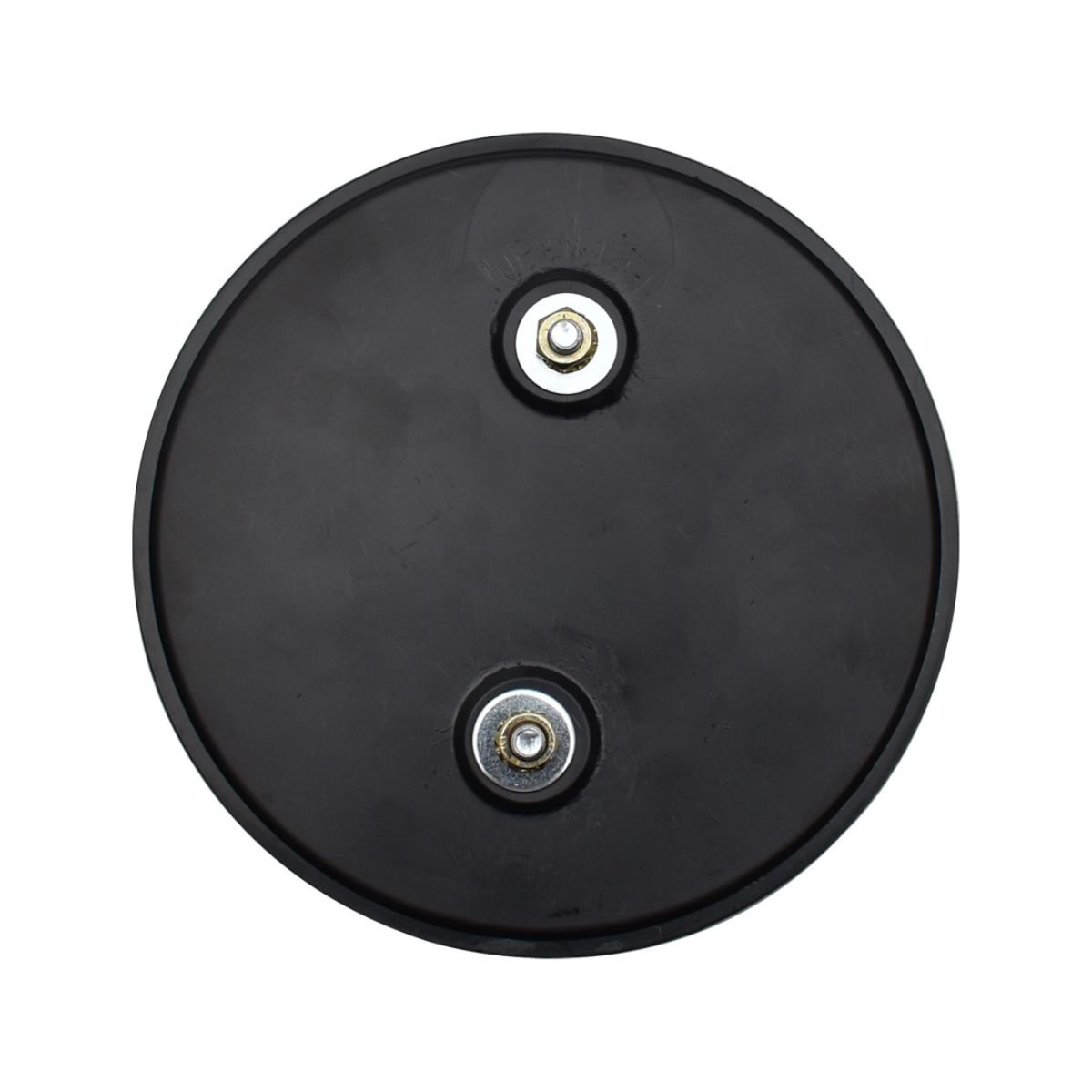 Dimensões aproximadas: 14,5 cm (diâmetro), 6,5 cm (distância entre parafusos)
