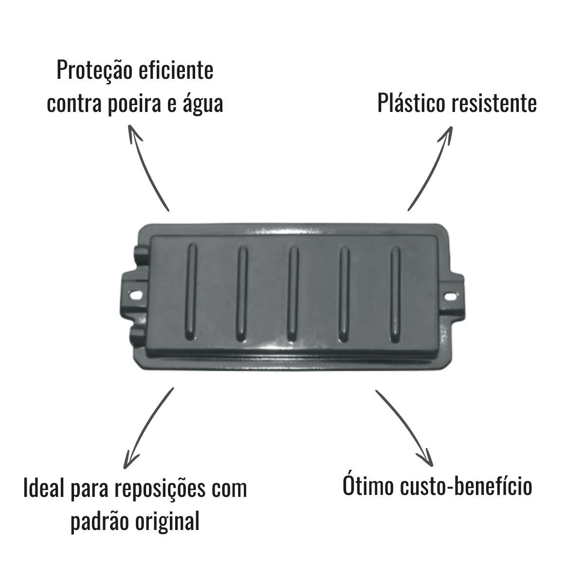Fabricada em plástico resistente, essa tampa apresenta excelente durabilidade mesmo sob condições severas de uso, além de ser leve e fácil de instalar. Ideal para reposições com padrão original e manutenção da integridade do sistema elétrico.
